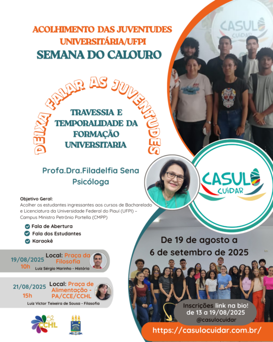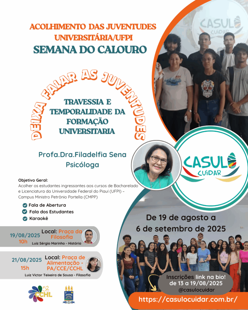 O Projeto Casulo Cuidar convida todos(as) os(as) estudantes e toda a comunidade acadêmica da Universidade Federal do Piauí (UFPI) – Campus Ministro Petrônio Portella (CMPP), para participar da Semana do Calouro – Acolhimento das Juventudes.
