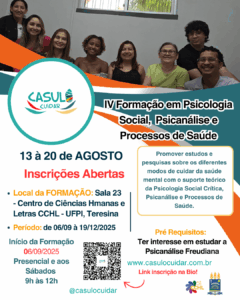 O Projeto Casulo Cuidar abre inscrições para a IV Formação em Psicologia Social, Psicanálise e Processos de Saúde, que acontecerá entre 06 de setembro e 19 de dezembro de 2025, sempre aos sábados, das 9h às 12h, de forma presencial, na Sala 23 do Centro de Ciências Humanas e Letras (CCHL/UFPI), em Teresina.