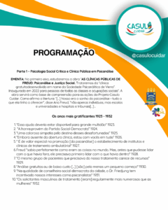 Estudo da obra As Clínicas Públicas de Freud: Psicanálise e Justiça Social, explorando a história da clínica gratuita criada em Viena para todas as classes e ocupações sociais, e seu impacto no campo da saúde mental.