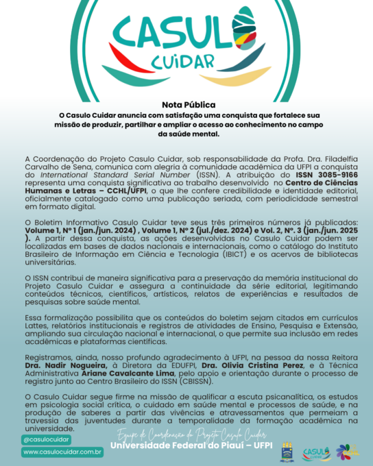 A Coordenação do Projeto Casulo Cuidar, vinculado ao Centro de Ciências Humanas e Letras da Universidade Federal do Piauí (UFPI), anunciou com alegria a conquista do International Standard Serial Number (ISSN 3085-9166) para o Boletim Informativo Casulo Cuidar.