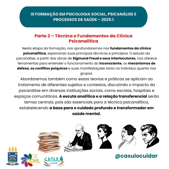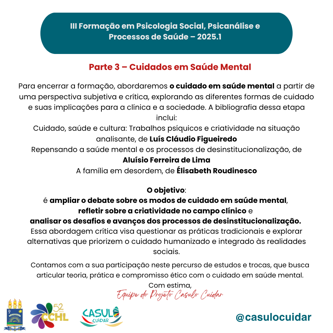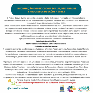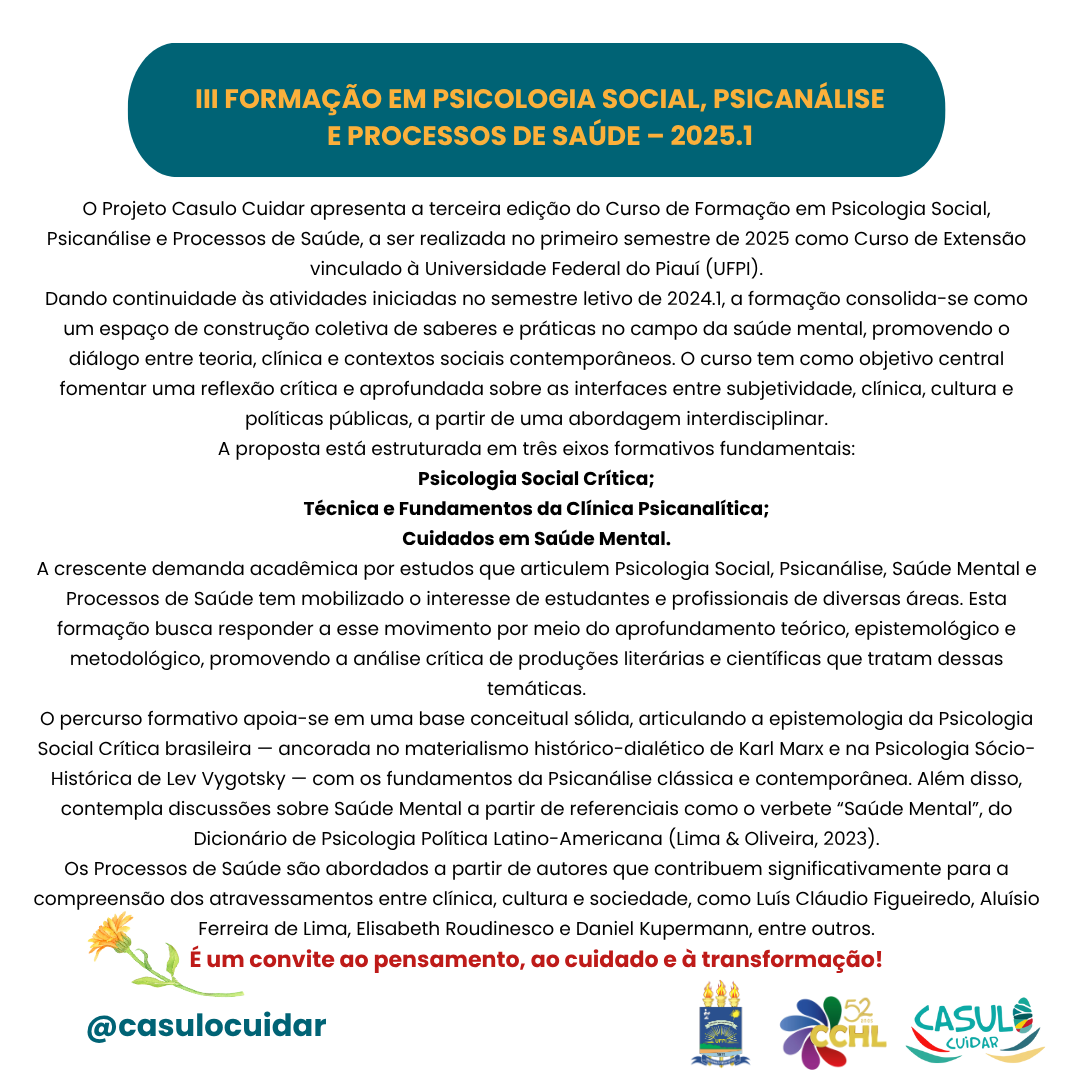 O Projeto Casulo Cuidar, vinculado à Universidade Federal do Piauí (UFPI), realizou no primeiro semestre de 2025 a terceira edição do Curso de Formação em Psicologia Social, Psicanálise e Processos de Saúde, como atividade de extensão universitária.