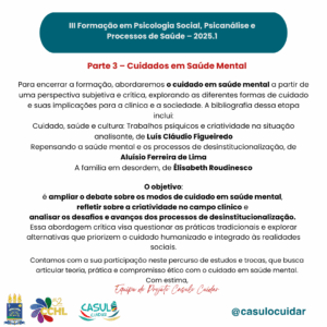 Encerrando o percurso formativo, o terceiro eixo promoveu uma reflexão crítica sobre os modos de cuidado em saúde mental, a partir de uma perspectiva subjetiva, cultural e interdisciplinar.