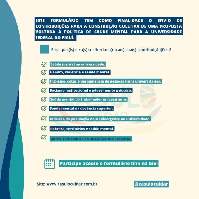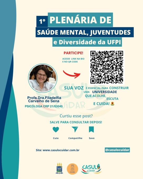 Organizada pelo projeto Casulo Cuidar, a plenária tem como principal objetivo reunir contribuições da comunidade acadêmica e da população piauiense para a elaboração de uma proposta de política de saúde mental voltada à universidade. Estudantes, docentes, técnicos, terceirizados e demais participantes estão convidados a contribuir com reflexões, demandas e sugestões por meio de um formulário disponível previamente.